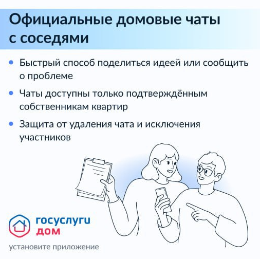 Управлять многоквартирным домом удобно вместе с соседями. В приложении Госуслуги.Дом есть три функции, которые помогут собственникам квартир обсуждать улучшения для дома в чатах, создавать коллективные обращения в управляющую организацию одной кнопкой и проводить общие собрания собственников без бумажной волокиты. Скачивайте приложение Госуслуги.Дом.